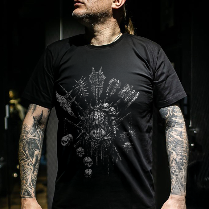 Dark Fantasy Weapons And Skulls Emblem Printed Men's T-shirt
